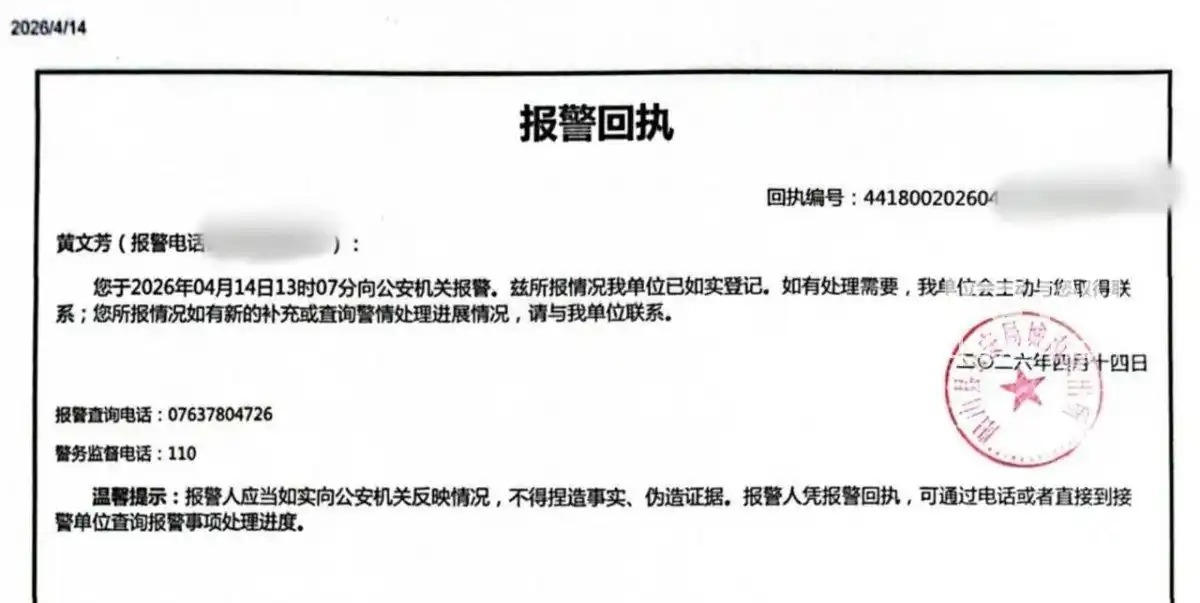 4月14日,宋柚运营方“柚香谷”针对信号新闻的报道发布了《情况说明》,否认与黄文芳医生有过任何合作。同时,一名昵称为“柚香谷”、IP显示属地上海的非认证账号向信号新闻发信息称,“经我司与黄文芳医生联系,黄医生从未喝过宋柚汁也不可能宣传宋柚汁降糖,相关内容系被人盗用头像P图伪造,已向当地公安机关报案处理、诉讼维权。”同时,该账号发来一份盖有广东省清远市“阳山县公安局城南派出所”公章的报警回执,主要内容为“黄文芳于2026年4月14日13时7分向公安机关报警。”信号新闻向上述派出所求证报警回执是否属实,工作人员称需经上级同意方能接受采访。截至发稿时,信号新闻未获答复。