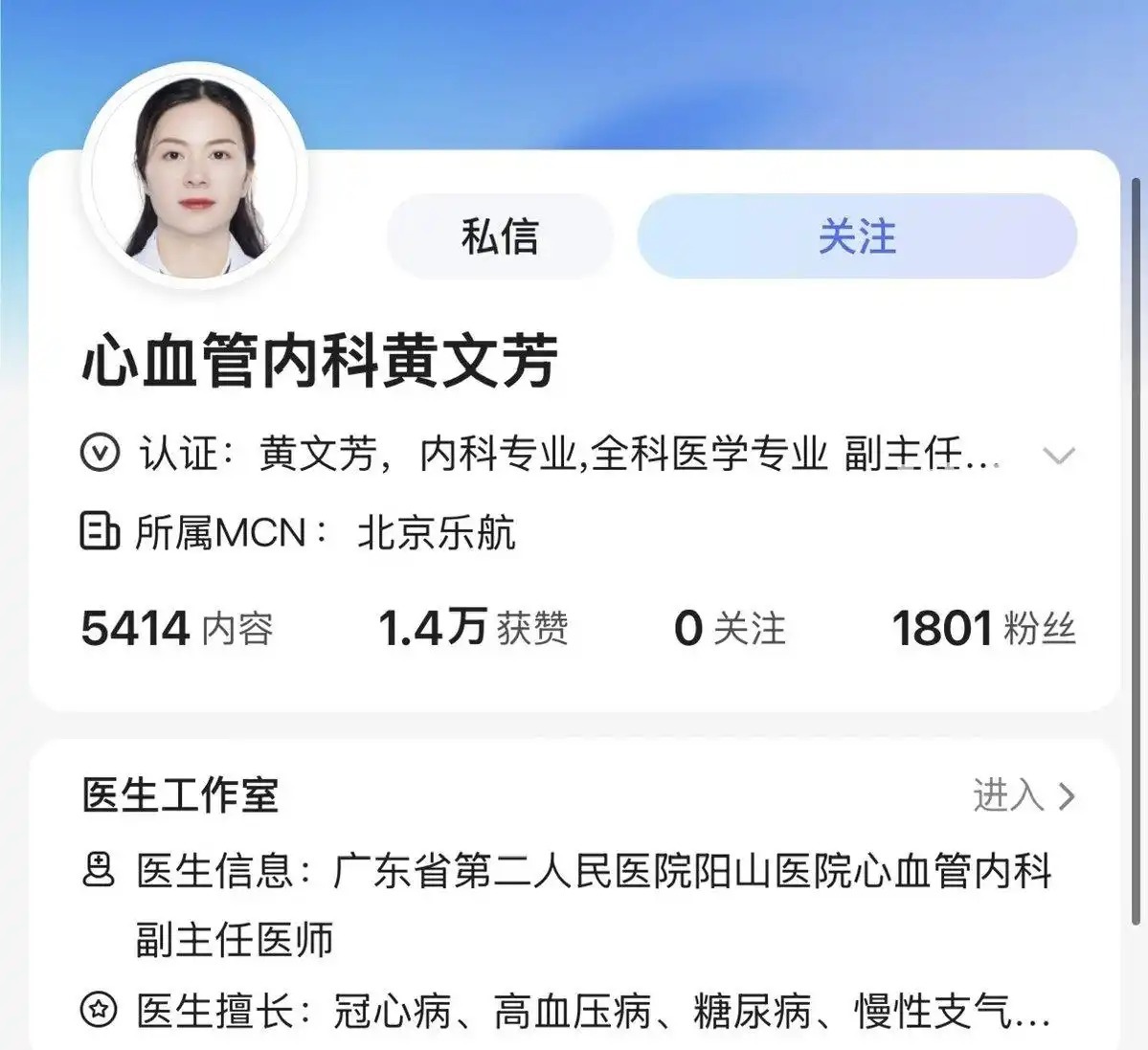 平台上黄文芳医生的认证信息。(来源:网络截图)信网·信号新闻4月16日讯 近日,信号新闻(0532-80889431)报道了《宋柚是商标、主要是糖水、柚汁是点缀、还吹能降糖 网友被柚香谷发律师函后,一怒揭了宋柚汁真相》一文,引起广泛关注。4月14日,浙江柚香谷控股股份有限公司(以下简称:柚香谷)发布情况说明,否认与发文推广宋柚汁的黄文芳医生有过任何合作,并称该司联系了涉事医生,医生称相关内容系被他人盗用头像P图伪造,已报警。信号新闻调查发现,除黄文芳外,还有其他认证为广东省清远市阳山县人民医院医生的账号也曾发布过宋柚汁的推广内容,且属同一家名为“北京乐航”的MCN机构。目前,广东省清远市阳山县、浙江省衢州市常山县相关部门已介入调查此事。柚香谷发布情况说明 否认与黄文芳医生存在合作炒股配资平台选