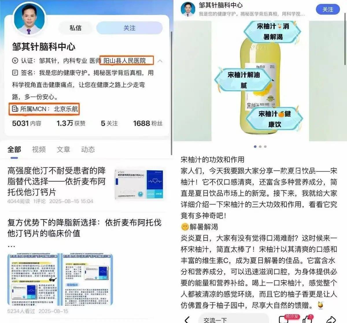 两位医师账号的认证信息均显示执业机构为阳山县人民医院,所属MCN机构也同为北京乐航,发布的文章均是医疗养生信息,也都在2025年7、8月份停更。