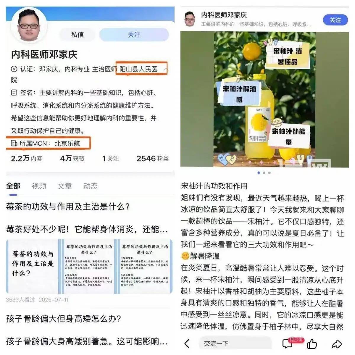 信号新闻注意到,“心血管内科黄文芳”这一账号隶属于一家名为“北京乐航”的MCN机构。进一步检索发现,2024年底至2025年初,网络平台上还有多名实名认证医师账号也发布了宋柚汁相关推广内容。账号“邹其针脑科中心”发布的一篇文章称宋柚汁具备“解暑解渴、解腻解油”等功效,称产品“独特成分能够中和油腻感,帮助消化、减轻肠胃负担”;账号“内科医师邓家庆”则以相同的标题《宋柚汁的功效和作用》发文,宣传宋柚汁“富含膳食纤维,能够帮助肠道蠕动,兜起并排出油脂”。